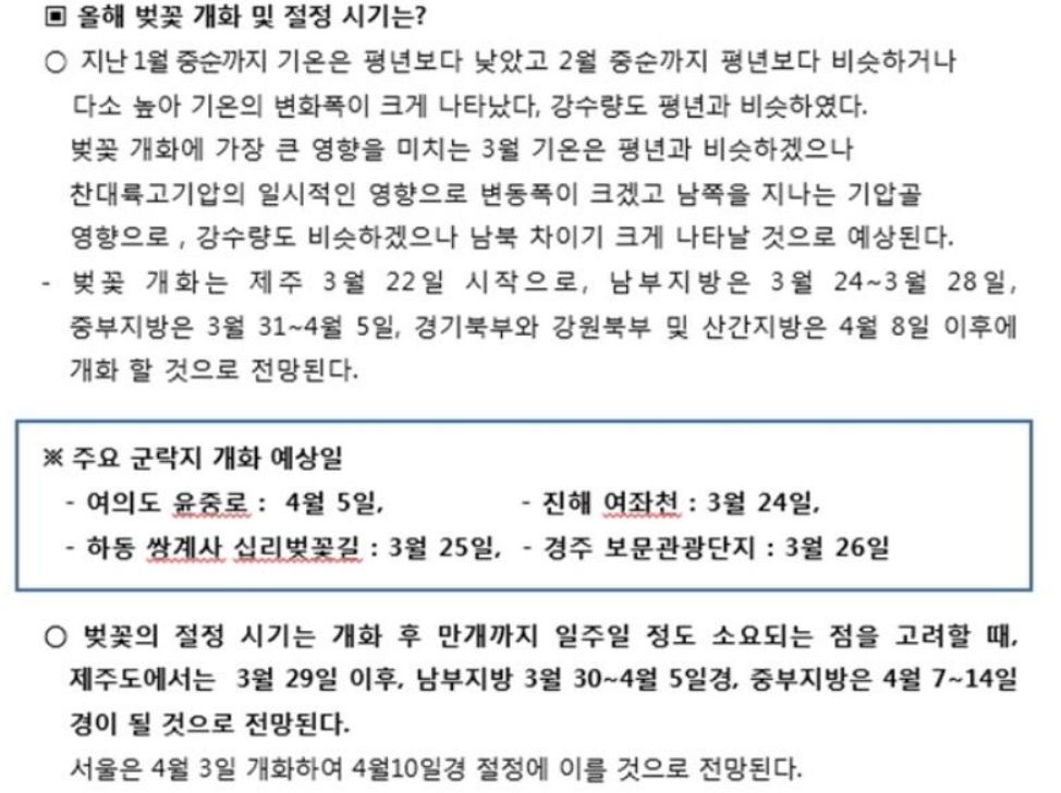 벚꽃 개화시기 2021는 평년보다 4일에서 7일 정도 빠르고 작년보다는 조금 늦다고 하더라구요. 벚꽃 개화시기 2021는 제주도 3월22일을 시작으로 남부지방은 3월24일 - 3월28일, 중부지방은 3월31일 - 4월5일로 예상되고 있으며, 경기 북부와 강원도 북부 및 산간지방은 4월8일 이후에 개화될 것으로 예상된다고 해요.
