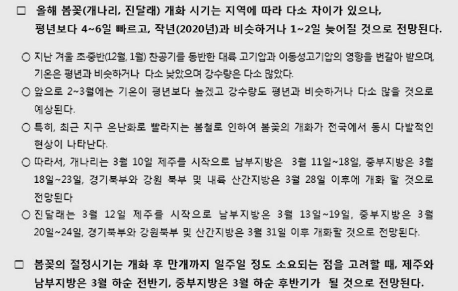 봄꽃의 절정인 만개 시기는 개화 후 만개까지 일주일 정도 소요 되기 때문에 제주와 남부지방 개나리 개화시기는 3월 하순 전반기와 중부지방의 개나리와 진달래 개화시기는 2021년 3월 하순 후반기가 될 것으로 예상된다고 하고, 벚꽃 개화시기는 여기서 확인 가능하답니다. 봄꽃 개나리와 진달래, 벚꽃 구경 예정이라면 날짜 확인하셔서 꽃놀이 즐기는데 도움이 되었으면 좋겠네요.