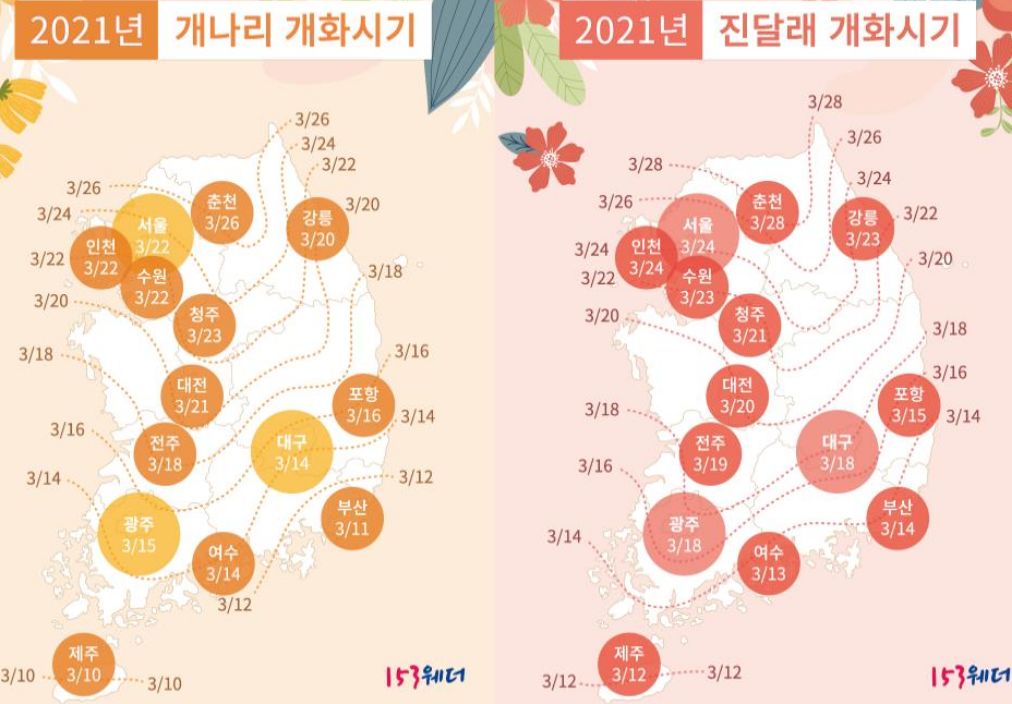 봄꽃 개나리와 진달래 개화시기 2021 출처는 153 날씨 웨더 홈페이지입니다. 추가 자세한 정보는 153 날씨 웨더에서 확인 가능하세요.