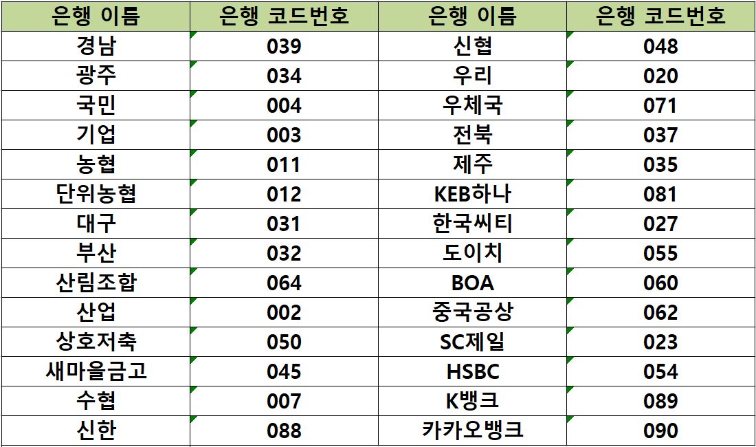 경남은행 코드번호 039, 신협은행 048, 광주은행 034, 우리은행 코드번호 020, 국민은행 004, 우체국 071, 기업은행 코드번호 003, 전북은행 037, 제주은행 035, KEB 하나은행 081, 대구은행 031, 씨티은행 027, 부산은행 코드번호 032, 도이치 055, 산림조합 064, BOA 060, 산업은행 002, 중국공상 062, 상호저축 050, 제일은행 023, 새마을금고 045, HSBC 054, 수협 007, K뱅크(케이뱅크) 089, 신한 088 입니다.