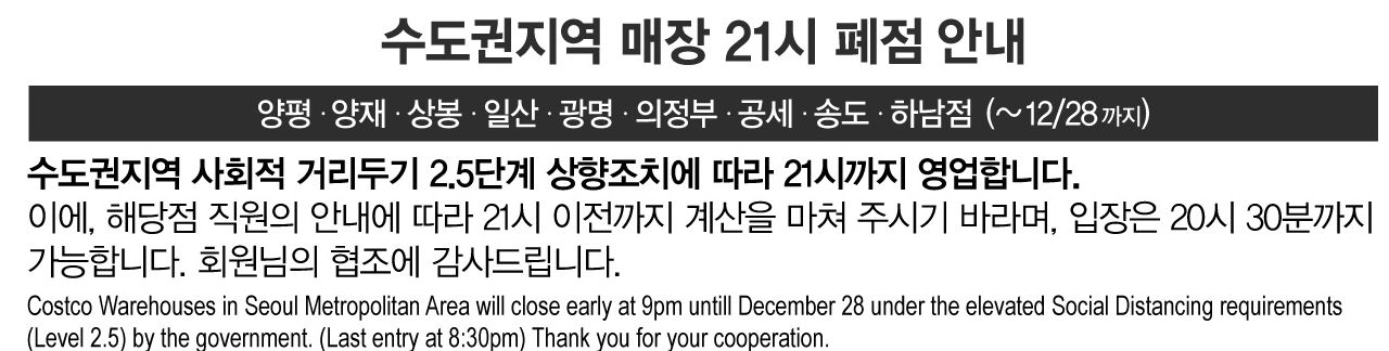 양재 코스트코 영업시간과 휴무일에 대하여 알아보도록 하겠습니다. 양재 코스트코 영업시간은 원래 오전 8시 - 오후 10시까지 이나, 수도권지역 코로나로 인하여 사회적 거리두기 2.5 단계 상향조치에 따라 12월28일까지 21시까지만 영업을 한다고 합니다. 그로 인하여 양재 코스트코 입장 가능 시간은 20시30분 입니다.