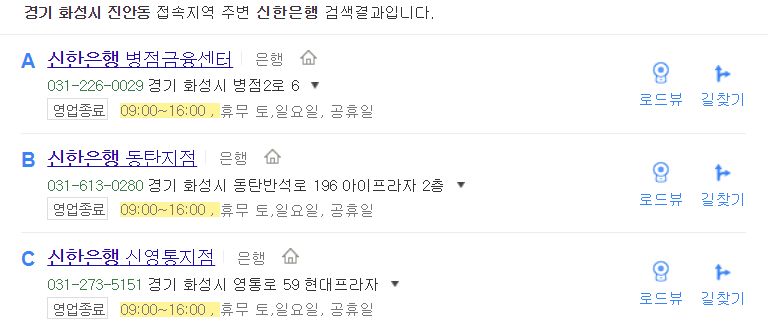 신한은행 영업시간은 9시부터 16시까지 이며, 대부분의 직장인들은 업무시간에 은행 방문이 어렵기 때문에 점심시간에 짬을 내어 방문을 하는분들이 계실텐데요, 신한은행 점심시간은 따로 없으며 직원분들이 교대로 식사를 하러 가시기 때문에 점심시간에 방문한다면 다른 영업시간에 비해 시간이 좀 오래걸릴수도 있겠더라구요.