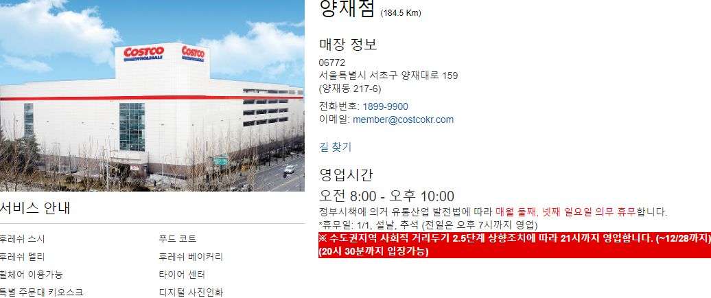양재 코스트코 영업시간과 휴무일에 대하여 알아보도록 하겠습니다. 양재 코스트코 영업시간은 원래 오전 8시 - 오후 10시까지 이나, 수도권지역 코로나로 인하여 사회적 거리두기 2.5 단계 상향조치에 따라 12월28일까지 21시까지만 영업을 한다고 합니다. 그로 인하여 양재 코스트코 입장 가능 시간은 20시30분 입니다.