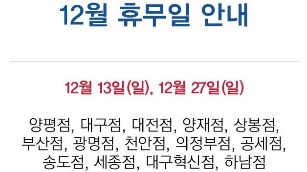 양재 코스트코 12월 휴무일은 12월 13일과, 12월 27일 입니다. 양재 코스트코 휴무일은 정부 시책에 의거 유통산업 발전법에 따라 매월 둘째, 넷째 일요일이 휴무일이며, 1월1일과, 설날, 추석 역시 휴무일 입니다. 설날과 추석 휴무일 전일같은 경우에는 오후 7시까지가 영업시간 입니다. 금주 일요일은 양재 코스트코 휴무일 입니다. 양재 코스트코 방문하실 예정이라면 사회적 거리두기 상향 조히로 인하여 영업시간이 당겨진 점과, 휴무일 확인하셔서 이용하시는데 불편함 없으셨으면 좋겠습니다.