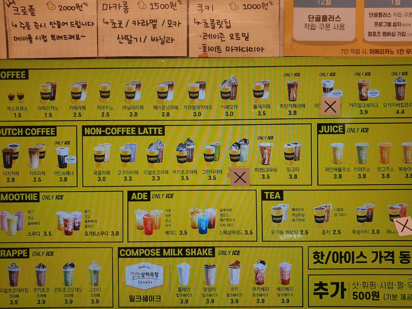 기본 커피메뉴는 에스프레소부터 돌체라떼, 흑당 카페라떼, 커피 밀크쉐이크 등이 있으며, 더치커피, 아인슈페너, 곡물라떼, 그린티 라떼, 쿠키 초코 라떼 등 다양한 논커피 라떼 종류도 있습니다. 컴포즈커피 메뉴에 핫, 아이스 가격은 동일하며 샷, 휘핑, 펄, 시럽 등 추가 금액은 500원 입니다.