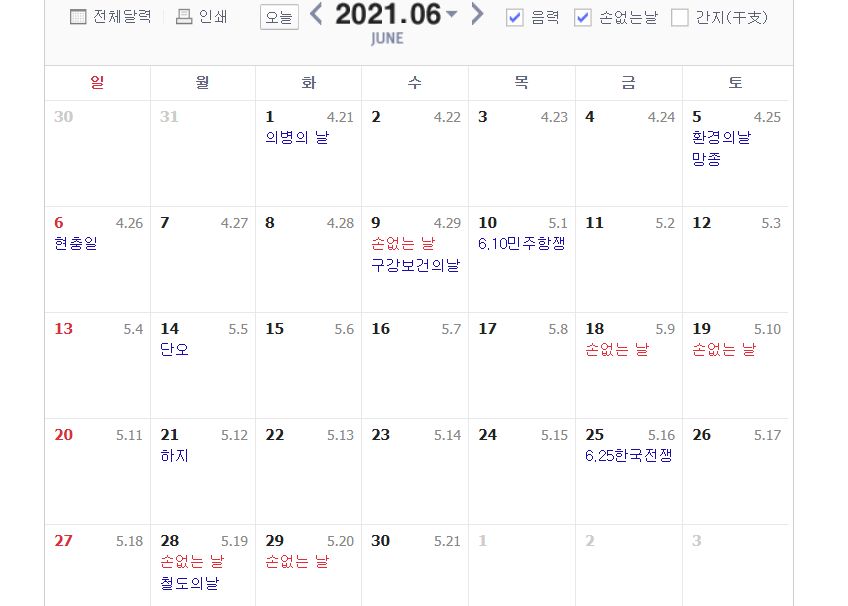 2021년 6월 손없는날 달력생활정보 2021. 5. 17. 23:52