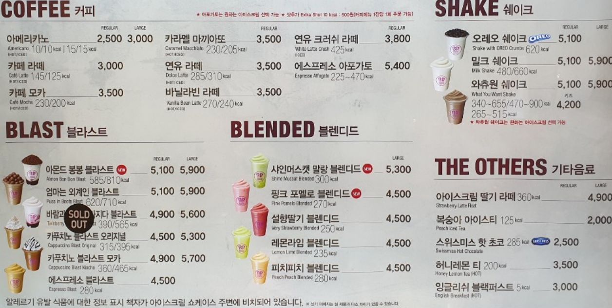배스킨라빈스 메뉴는 아이스크림 외 커피, 쉐이크, 블라스트, 블렌디드, 기타 음료 등이 있으며, 케이크 종류도 다양하게 있답니다. 가격은 메뉴판 사진들 확인하시면 될 것 같아요.