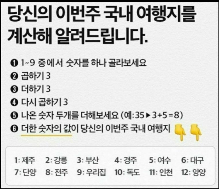 당신의 추석 연휴 국내여행지 추천 계산해서 알려드립니다. 어디로 나왔나요? 9번 우리집 아닌가요? 2021년 추석 연휴 국내여행지 추천은 전국민 우리집인듯 우리집 찾아오시면 안되구요 각자의 집에서 오붓하게 보내는 시간 가져보세요!