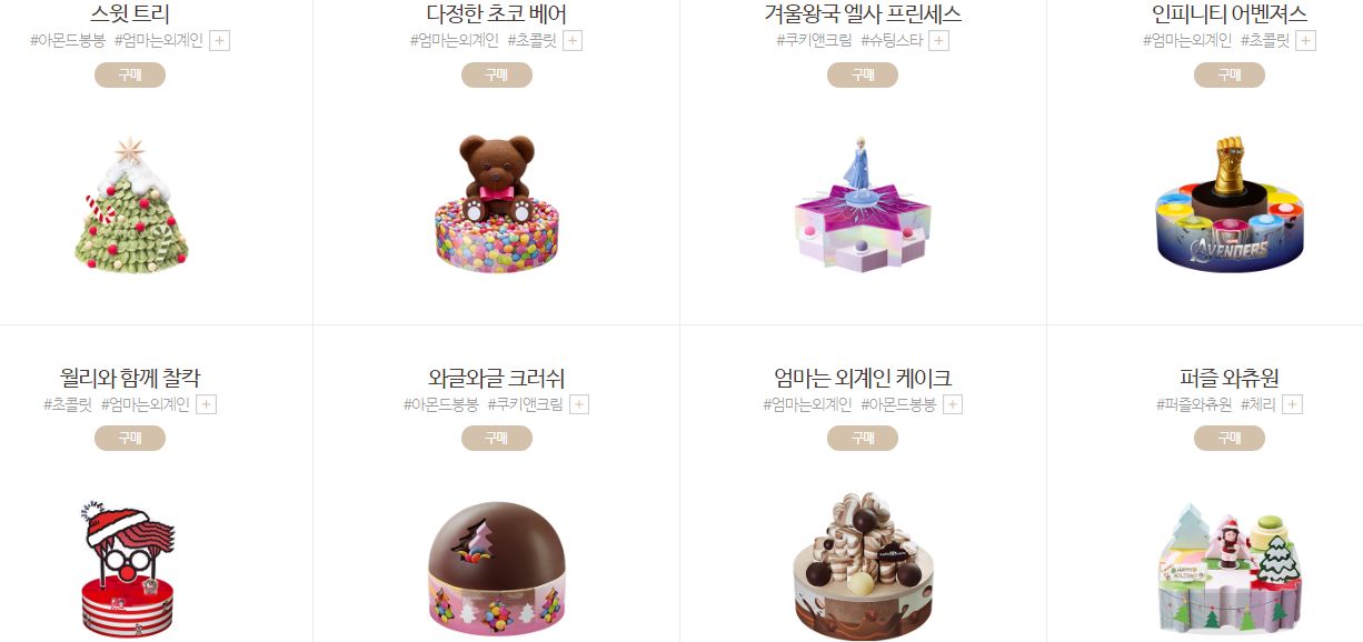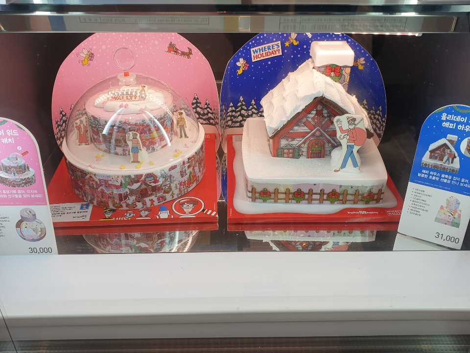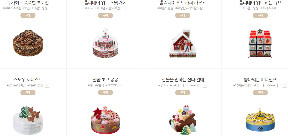 크리스마스 느낌나는 홀리데이 위드 해피하우스 아이스크림케익이 눈에 먼저 들어왔는데요, 가격은 31,000원이고, 맛은 아몬드봉봉, 이상한나라의 솜사탕, 블루베리치즈 케이크 등이 들어 있더라구요.