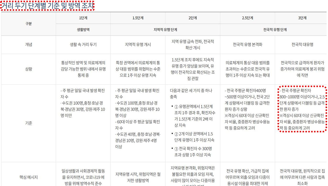 거리두기 단계별 기준 및 방역 조치입니다. 3단계 거리두기 기준은 전국적 대유행으로, 전국적으로 급격하게 환자가 증가하여 의료체계 붕괴 위험에 직면하게 되는 상황이며,