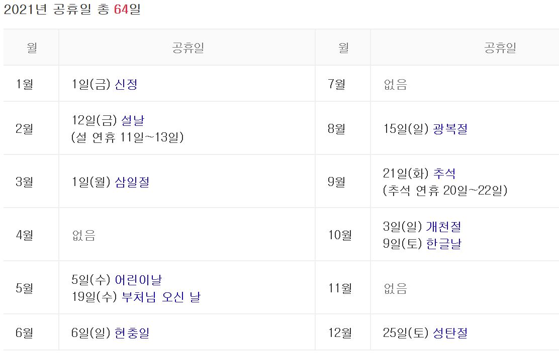 내년 2021년 공휴일 수 확인하시고 연차를 어떻게 쓸까 행복한 고민해보는 시간 가져보도록 하겠습니다.