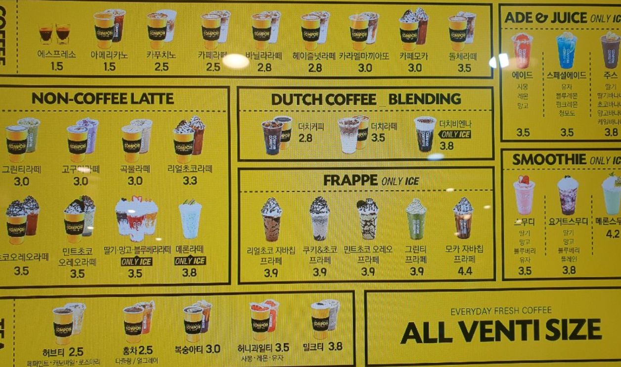 저는 카페에서 커피를 마시는걸 참 좋아하는 사람입니다. 요즘은 카페 내부에서는 마실 수 없고 테이크아웃만 가능한 시국이라 저렴한 카페를 찾게 되는데요, 오늘은 올 사이즈 벤티로 저렴한 가격에 판매하고 있는 컴포즈커피 메뉴와 가격에 대하여 알아보도록 할게요.