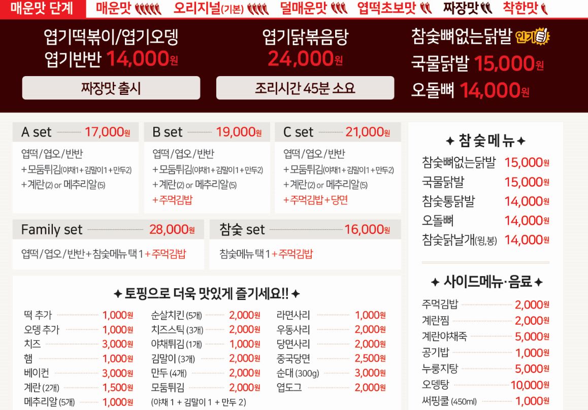 엽기떡볶이의 원조 엽떡! 매운맛은 상상 이상으로 맵지만 자꾸만 먹고싶어지는 중독성이 강한 일품 떡볶이지요.엽기오뎅, 엽기반반 떡볶이 가격은 14,000원 입니다. 동대문 엽기떡볶이 메뉴는 매운맛 단계 5가지 조절이 가능하며, 2인 떡볶이는 엽떡 초보맛이나 짜장맛이 없으니 참고하여 주시길 바랄게요.