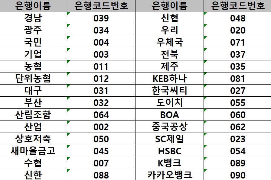 보통은 발급받은 통장이나 보안카드 뒷면에 각 은행 코드번호가 기재되어 있지만 급하게 이체를 해야될때에는 그게 생각이 나지 않더라구요.