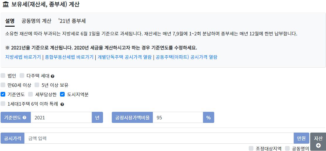 보유세, 재산세, 종부세, 공동명의 종부세, 양도세, 부동산 수수료 등 종합부동산세 계산기 기능을 제공하고 있는 사이트이니, 국세청 종부세 계산기가 나오기 전까지 부동산에 대한 모든 세금 및 수수료 등 확인하시는데 도움이 되었으면 좋겠습니다.