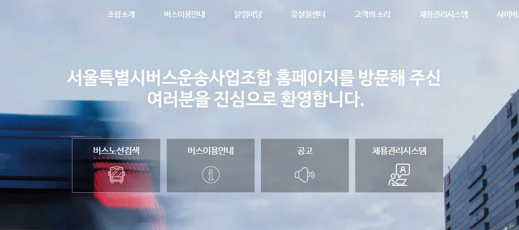 서울버스 운송 사업 조합은 1975년도에 설립되어 1천만 서울 시민의 발로, 2만여 서울시내버스 종사자들이 있으며, 서울 버스 체계 밀 이용방법, 노선도, 분실물 공지 등 다양한 정보를 제공하고 있습니다.