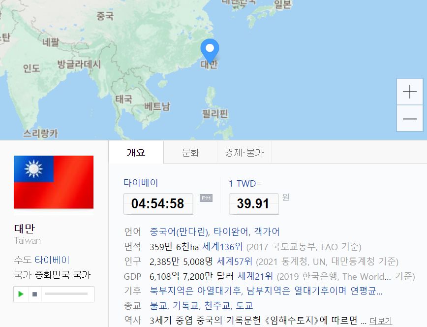 네이버 검색에 따른 대만 인구는 세계 57위로 2,385만 5,008명이며 2021년 대만통계청 기분 수치라고 합니다. 참고로 대한민국 한국 인구는 5,182만 1,669명으로 세계 28위 랍니다.