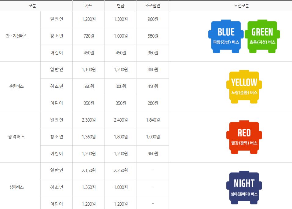 서울 시내 버스 요금은 2015년 부터 인상되지 않았으며, 서울 시내 버스는 간선 지선 버스와, 순환버스, 광역버스, 심야버스, 마을버스로 크게 나뉘어져 있습니다.